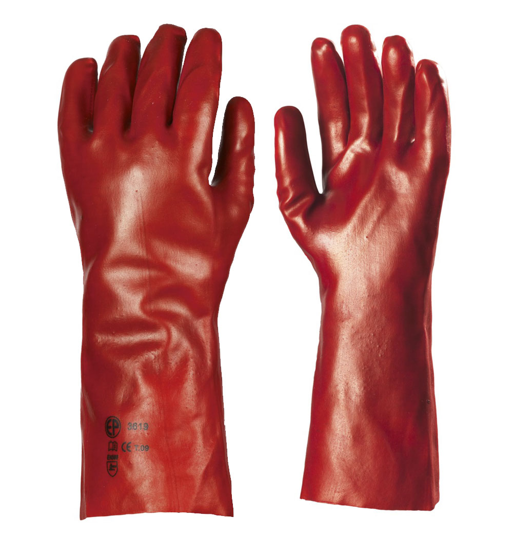 Tricot sans couture en polyester, Enduction totale en PVC rouge, Manchette longue ; Longueur totale 36cm,